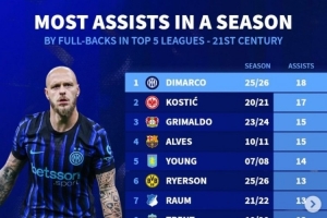 24直播网4月28日讯 德转统计五大联赛本世纪边后卫单赛季助攻次数排行榜,迪马尔科25/26赛季18次居首,阿诺德、阿尔维斯、科斯蒂奇两度上榜。