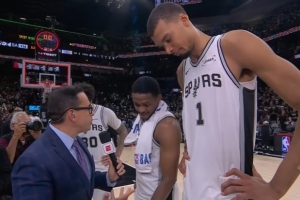 24直播网4月29日讯 首轮系列赛,马刺114-95轻取开拓者,大比分4-1绅士横扫。文班亚马和福克斯赛后在场边接受了媒体采访,以下为采访全文。