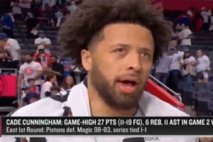 24直播网4月23日讯 首轮系列赛G2,活塞98-83轻取魔术将大比分扳为1-1平。赛后坎宁安在场边接受了媒体采访,以下为采访全文。