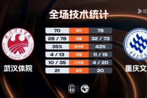 第四节,秋菊补篮得手,但重庆文理命中率明显下降,张晓突然发力,独中3记三分拿到9分帮助球队缩小分差,无奈此前球队落后太多,时间所剩无几。最终,重庆文理79-70力克武汉体院。